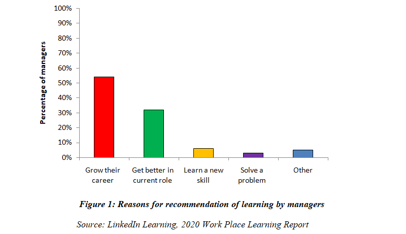 As depicted above, according to LinkedIn Learning, 2020 Work Place Learning Report, 54% of the managers recommend learning to their teams for their career growth, 32% recommend it for enabling employees to perform better in their current role,6% and 3% suggest training to their employees for developing new skill and solving a problem respectively. Five percent managers have other reasons for recommending it.