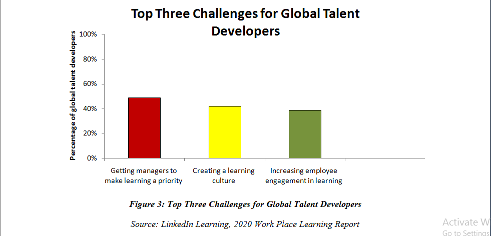Organizational culture has a great impact on the work life experience, motivation and performance of employees. Facilitating employee training and development fosters a learning culture in the organization and motivates the human resources to regularly hone their skills and abilities for self and organizational growth. According to the LinkedIn Learning, 2020 Work Place Learning Report, in which the global talent developers were asked about their top three challenges this year, getting managers to make learning a priority is the biggest challenge confronted by the talent developers globally (49%), followed by creating a learning culture (42%) and increasing employee engagement in learning (39%).